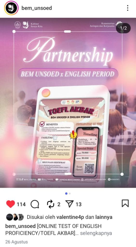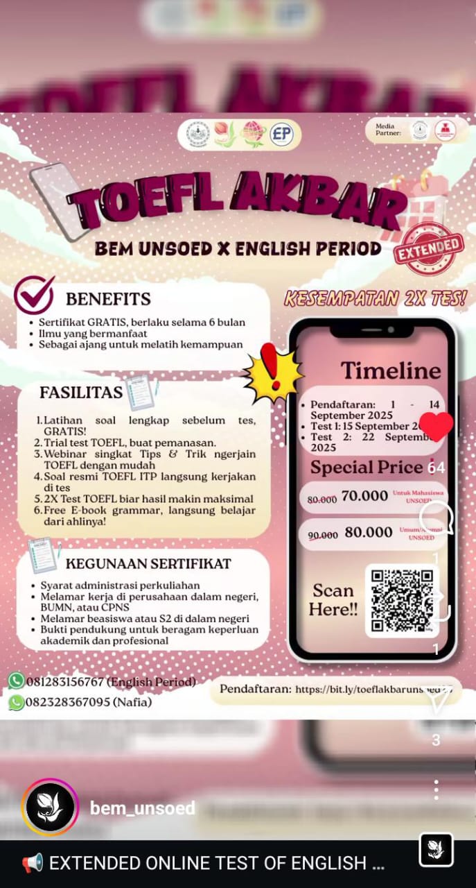 BEM Unsoed — Telah dilaksanakan salah satu program kerja Kementerian Jaringan dan Kerja Sama Badan Eksekutif Mahasiswa Universitas Jenderal Soedirman (Jaker BEM Unsoed) 2025, yaitu BEM Unsoed dan English Period Gelar TOEFL Akbar Online 2025, yang berkolaborasi dengan English Period untuk menyelenggarakan acara TOEFL Akbar Online 2025. Acara ini dilaksanakan secara daring, dengan pendaftaran pada (1-14/9) 2025, serta tes pada (15 dan 22/9) 2025.