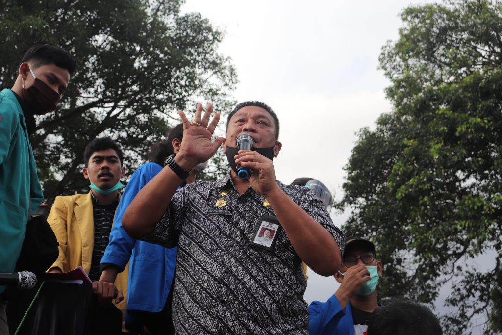 Satu jam setelah aksi digelar, sekitar pukul 14.00 WIB, perwakilan DPRD akhirnya menemui massa. Perwakilan DPRD tersebut ialah Ketua DPRD, Budhi Setiawan, dan beberapa perwakilan dari fraksi partai yang terlibat dalam pengesahan Omnibus Law. Setelah itu tuntutan disampaikan oleh perwakilan massa aksi, Afdhal Yuriz, yang juga merupakan Menteri Kajian dan Aksi Strategis BEM Unsoed 2020.