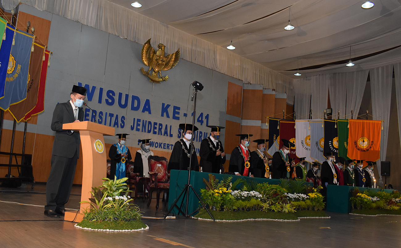 Kemudian, salah satu perwakilan wisudawan, Ghazy Primabudi Perdhana, dalam sambutannya juga menyampaikan terima kasih dan penghargaan setinggi-tingginya kepada Rektor, Wakil Rektor, Dekan, Ketua Program Studi, dosen, dan civitas akademika Unsoed, atas segala ilmu pengetahuan dan berbagai pembelajaran yang luar biasa, bimbingan, dan dedikasiya dalam membimbing mahasiswa.