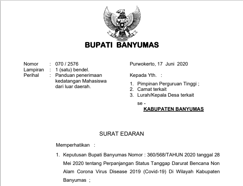 Jadi kemarin (17/6) Bupati Banyumas, Achmad Husein telah mengeluarkan surat edaran nomor 070/ 2576 yang berisi infomasi tentang panduan penerimaan kedatangan mahasiswa dari luar daerah. Surat ini ditujukan pada universitas, camat, dan lurah untuk mendata dan menerapkan protokol kesehatan bagi mahasiswa baru maupun lama yang akan masuk dan atau sudah berada di kos.