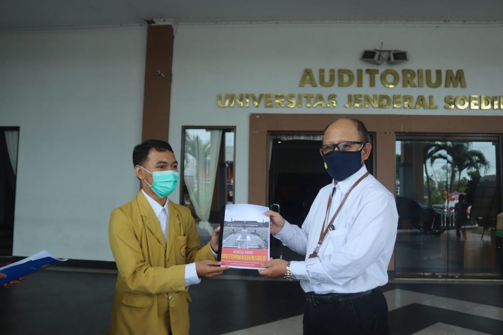 Setelah selesai acara Sidang Terbuka Senat, Ketua BEM Unsoed, Lugas Ichtiar, menyerahkan kertas posisi yang berisikan tugas Unsoed dengan tema “Reformasi Unsoed” kepada Rektor, Prof. Dr. Ir. Soewarto, M.S. Kertas posisi tersebut berisi 3 poin penting, yaitu: