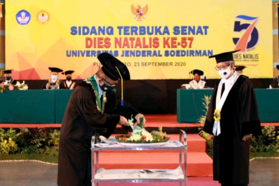 Ada dong! Jadi, pada hari Rabu (23/09) Unsoed melaksanakan Sidang Terbuka Senat dalam rangka Dies Natalis ke-57 yang dilaksanakan di Auditorium Graha Widyatama. Berbeda dengan tahun sebelumnya, Sidang Terbuka Senat tahun ini dilakukan secara offline dan online dengan tetap memperhatikan protokol kesehatan.