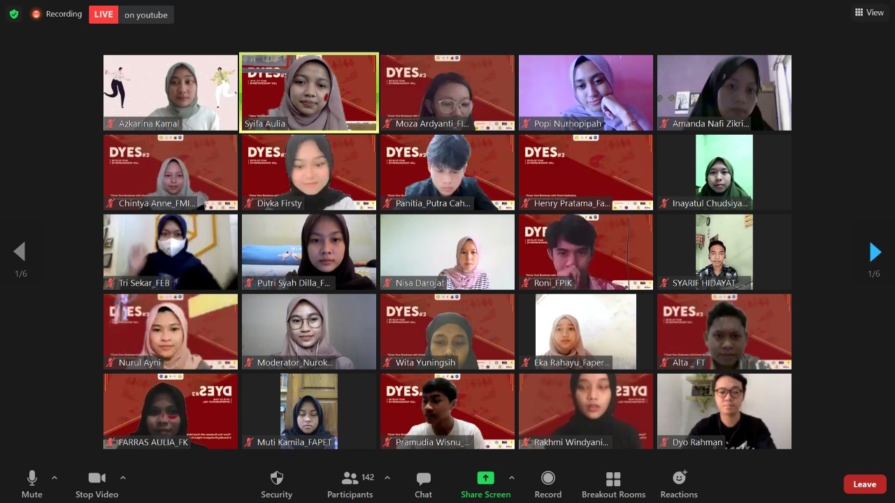 Webinar DYES ini, dibuka dengan sambutan dari Menteri Ekonomi Kreatif Mahasiswa BEM Unsoed, Popi Nurhopipah. Kemudian, dilanjutkan dengan pemaparan materi dari Dyo Fathu Rahman selaku Co-Founder dan CMO Harisenin.com, lalu dilanjutkan dengan pemaparan materi kedua oleh Azkarina F. Kamal selaku founder E-Look. Setelah itu diadakan sesi diskusi dan tanya jawab bersama para peserta Webinar DYES 2. Acara ini, diakhiri dengan pemberian sertifikat kepada Dyo Fathu Rahman dan Azkarina F. Kamal selaku pemateri dan dilanjutkan dengan sesi dokumentasi.