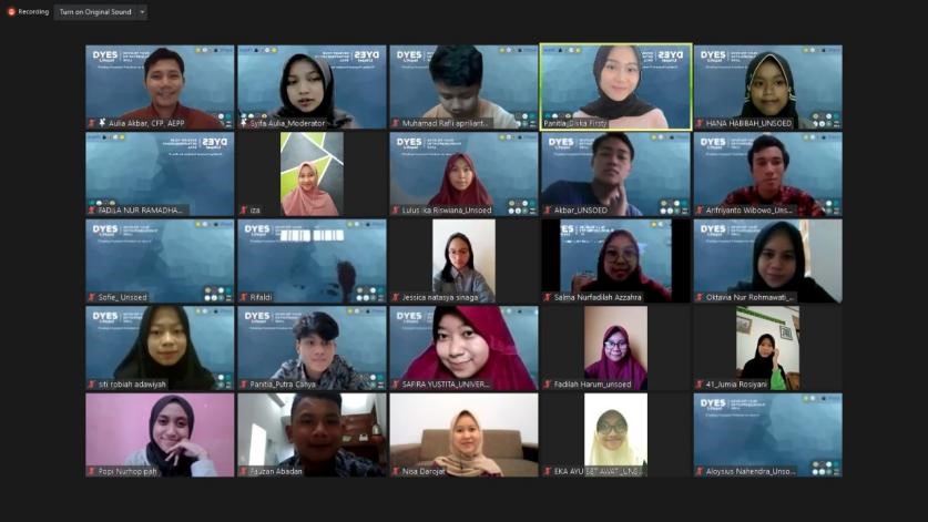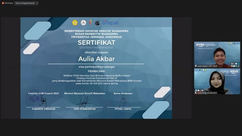 Webinar ini dibuka dengan sambutan dari Menteri Ekonomi Kreatif Mahasiswa BEM Unsoed, Popi Nurhopipah. Kemudian, dilanjutkan dengan pemaparan materi dari Aulia Akbar selaku Financial Planner dari Lifepal. Setelah itu diadakan sesi diskusi dan tanya jawab bersama para peserta Webinar DYES X Lifepal. Acara ini, diakhiri dengan pemberian sertifikat kepada Aulia Akbar selaku pemateri dan dilanjutkan dengan sesi dokumentasi.