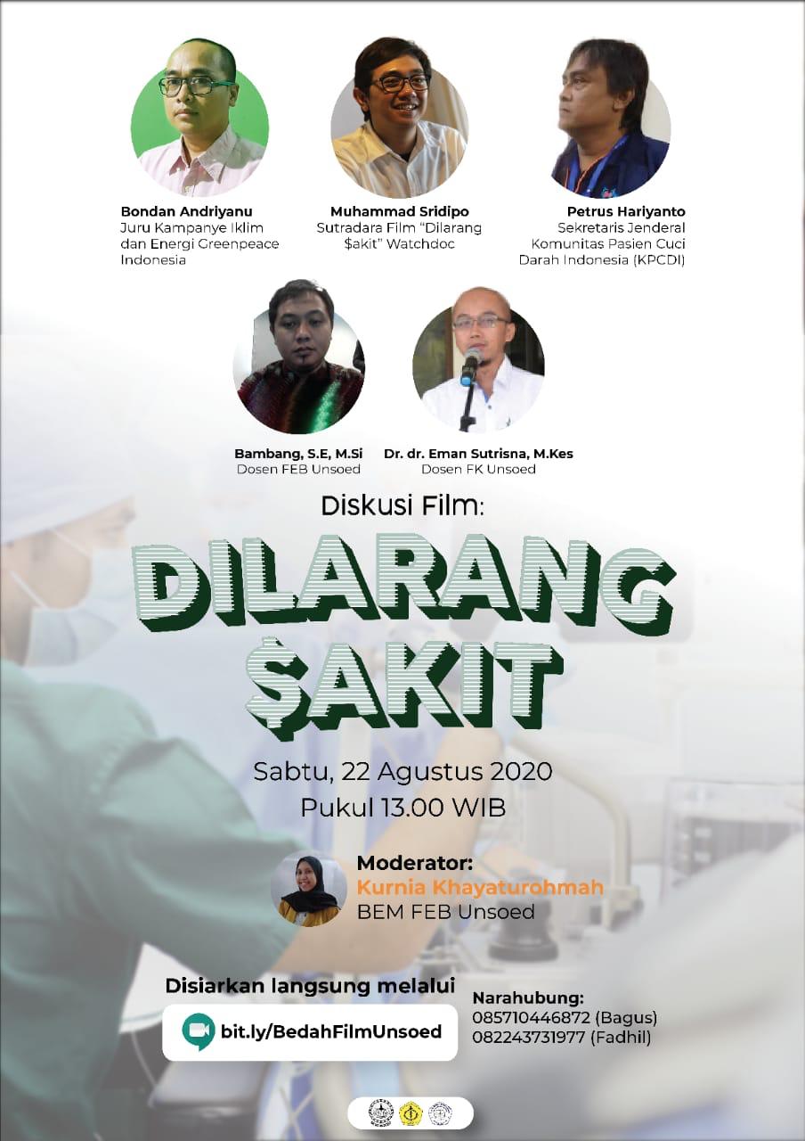 Agenda ini membahas permasalahan yang ada di dalam film “Dilarang $akit”, terutama terkait permasalahan BPJS serta kualitas udara yang berpengaruh kepada kesehatan masyarakat. Diskusi dibuka oleh moderator Kurnia Khayaturohmah, Staff Kastrat BEM FEB Unsoed, dengan menghadirkan lima narasumber: