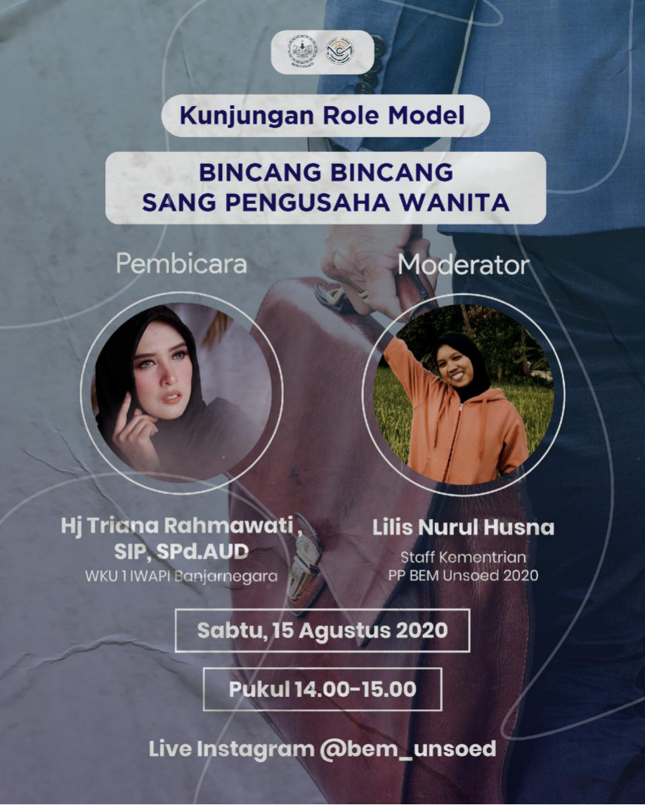 Tema yang diangkat pada Kunjungan Role Model yang kedua adalah “Bincang-Bincang Sang Pengusaha Wanita” dengan mengundang seorang pengusaha wanita yaitu Triana Rahmawati, SIP, SPd.PAUD. Agenda ini berlangsung sejak pukul 14.00-15.00 WIB melalui live Instagram akun BEM Unsoed (@bem_unsoed).