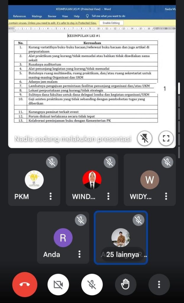 BEM Unsoed – Telah dilaksanakan Lingkar Keilmuan Soedirman (LKS) #2 pada Minggu, 30 Juli 2023 secara daring melalui G-Meet. Lingkar Keilmuan Soedirman merupakan program kerja yang diselenggarakan oleh Kementerian Penelitian dan Keilmuan BEM Unsoed. Pertemuan pada kali ini merupakan pertemuan kedua dari kegiatan LKS 2023 yang bertujuan untuk menampung berbagai keluhan-keluhan, kritik, saran, masukan, serta membagikan informasi terkait keilmuan yang ada di Universitas Jenderal Soedirman dari beberapa organisasi mahasiswa di Universitas Jenderal Soedirman khususnya di bidang keilmuan, pendidikan, penalaran, penelitian, keilmuan, dan sebagainya.