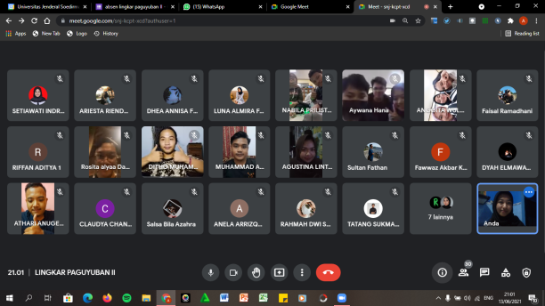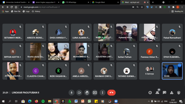 BEM Unsoed – Telah berlangsung Lingkar Paguyuban II yang dihadiri oleh seluruh pengurus Kementerian Dalam Negeri BEM Unsoed, perwakilan Paguyuban Mahasiswa Daerah di Unsoed dan perwakilan dari panitia Festival Budaya Unsoed (FBU) pada (13/06) via Google Meet. Acara ini dilakukan sebagai tindak lanjut program kerja yang dimiliki Kementerian Dalam Negeri BEM Unsoed dan bertujuan membahas agenda dari Kementerian Dalam Negeri yaitu Liga E-sport Paguyuban (LEP), membahas evaluasi expo tahun kemarin, serta sedikit membahas mengenai acara Festival Budaya Unsoed (FBU) oleh panitia.