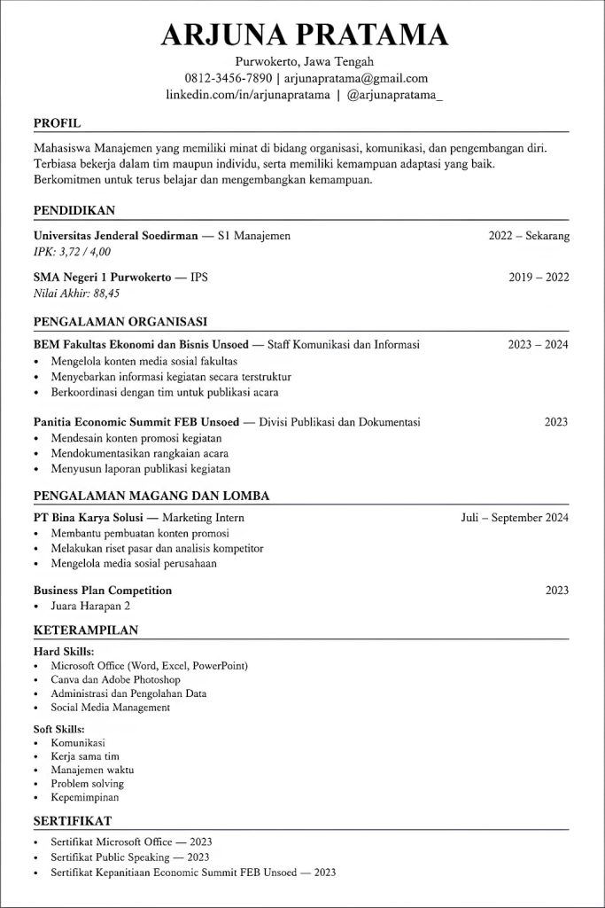 Oh iya, Sobat punya sertifikat atau pencapaian? Boleh banget dicantumkan di CV, apalagi kalau masih sesuai dengan bidang atau tujuan yang Sobat incar, seperti lomba, pelatihan, atau kursus. Namun, tidak perlu semuanya dituliskan, ya. Cukup pilih yang paling relevan agar CV tetap fokus dan mudah dibaca. Sertifikat juga tidak harus dilampirkan, kecuali jika diminta atau memang diperlukan sebagai dokumen pendukung.