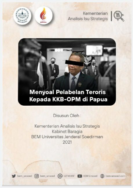 Telah dilaksanakan agenda Pengiriman kajian ilmiah tentang “Menyoal Pelabelan Teroris Kepada KKB-OPM di Papua” pada kamis 9 juli 2021 pukul 09.00 WIB. Pengiriman kajian ilmiah tersebut ditujukan kepada menteri koordinator politik, hukum, dan HAM yang merupakan agenda dari Kementrian Aksi Propaganda BEM Unsoed.