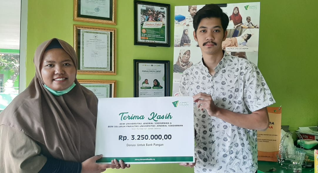 Menggandeng lembaga sosial Dompet Dhuafa, sebagian donasi sejumlah Rp. 3.250.000 dan 100 bungkus mie instan telah diserahkan pada Jumat (10/4) untuk membantu masyarakat yang tinggal di sekitar lingkungan Unsoed. Uang tersebut  digunakan untuk pengadaan beras 150 kg , minyak 50 lt, sarden 50 kaleng, dan 250 bungkus mie instan yang akan dibagi menjadi 50 paket sembako.
