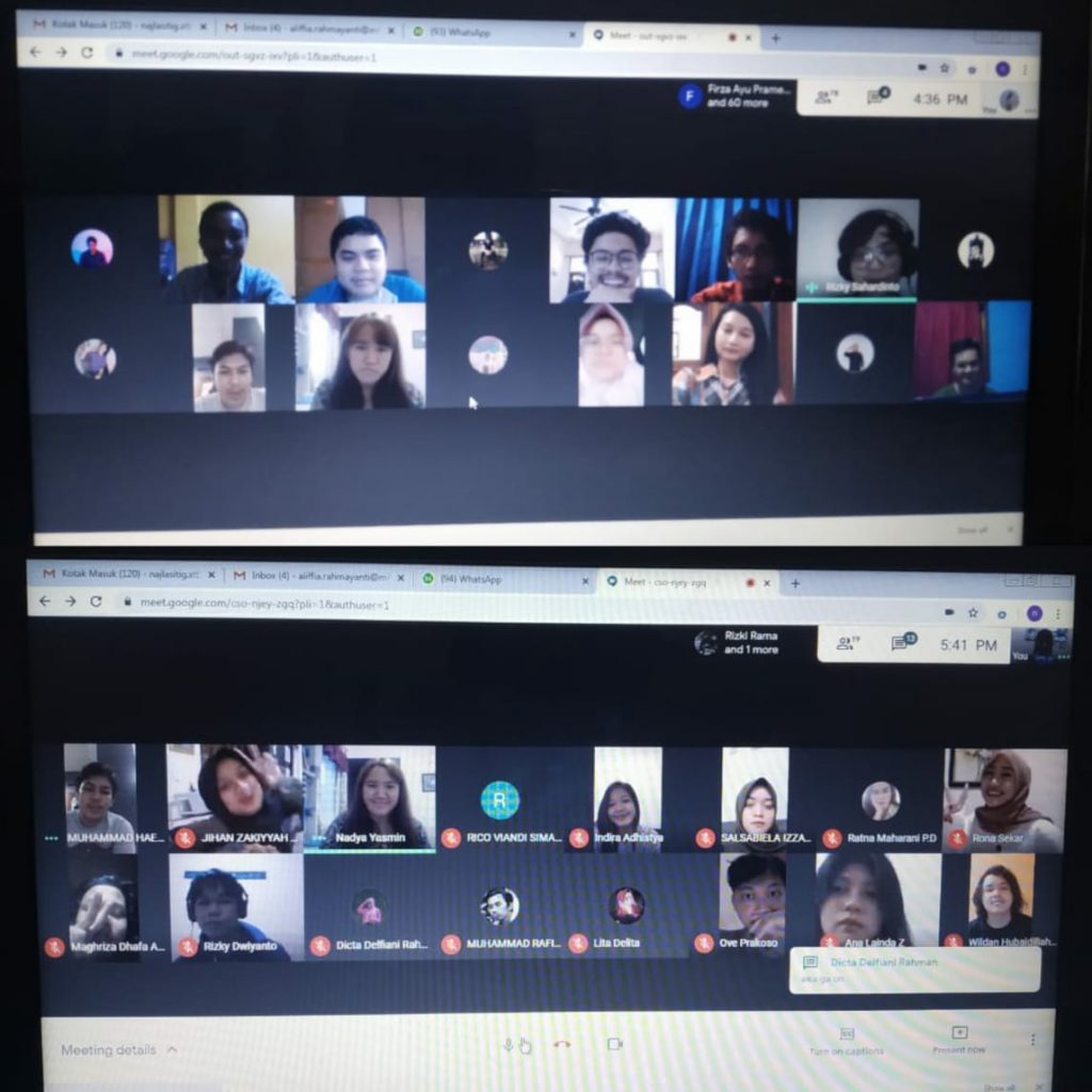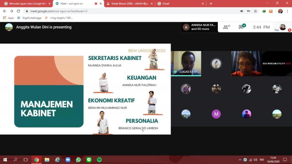 Agenda ini dilaksanakan pada Selasa (16/06) melalui Google Meet pada pukul 15.15-17.30 WIB dan terbagi menjadi dua sesi. Roadshow kali ini dimoderatori oleh perwakilan staff dari Kementerian Luar Negeri BEM FH. Sesi pertama dilakukan di room Google Meet utama, dibuka dengan pemaparan pengenalan kabinet dan grand proker BEM Unsoed oleh Presiden BEM Unsoed Kabinet Muara Cita, Lugas Ichtiar. Pemaparan dilanjutkan oleh BEM Fakultas Hukum mengenai kabinet dan struktur kabinet BEM Fakultas Hukum oleh Presiden BEM Fakultas Hukum Kabinet Barajuang, Laudzira Farrel. Sesi pertama pada room utama kemudian ditutup dengan foto bersama melalui tangkapan layar.