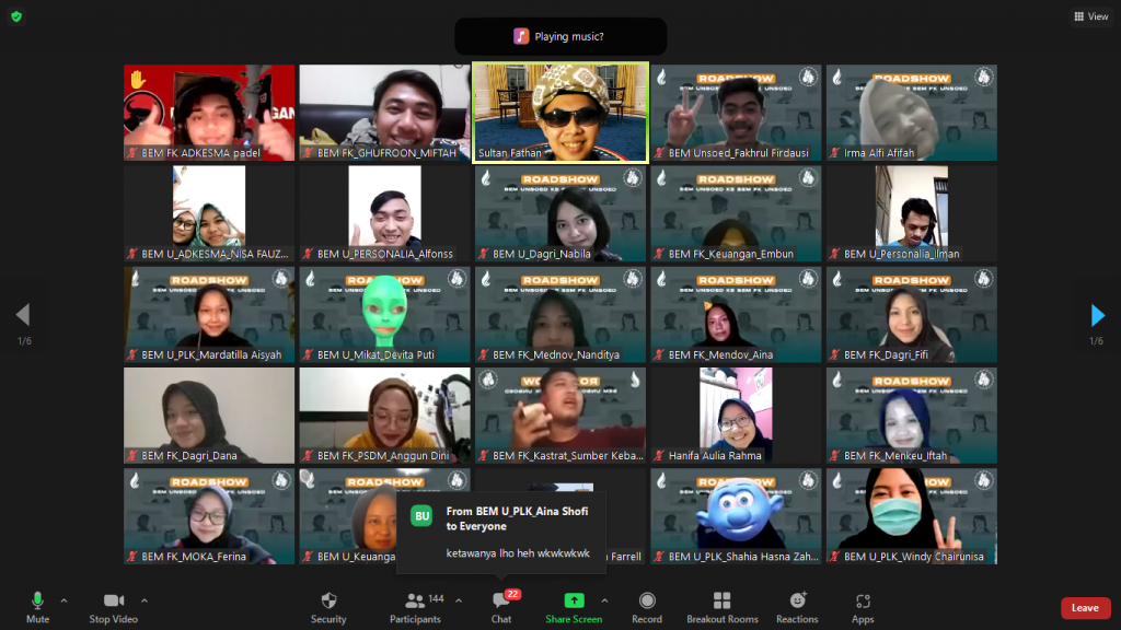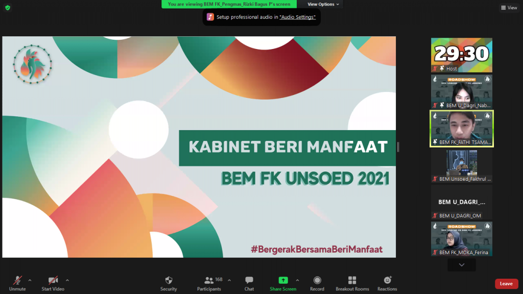 BEM Unsoed – Telah berlangsung Roadshow BEM Unsoed bersama BEM FK pada (20/8) via Zoom Meeting yang merupakan program kerja dari Kementerian Dalam Negeri BEM Unsoed 2021. Roadshow kali ini, dihadiri oleh seluruh pengurus BEM Unsoed 2021 Kabinet Baragia dan seluruh pengurus BEM FK 2021 Kabinet Beri Manfaat. Program kerja ini, bertujuan untuk mempererat tali silaturahmi antara BEM Unsoed dengan BEM FK, juga sosialisasi mengenai agenda-agenda BEM Unsoed.