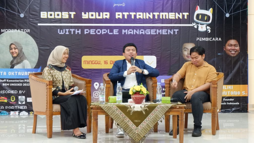 Pada puncak acara School Of Leadership Organization yaitu Talkshow dilaksanakan secara hybrid yang dilaksanakan secara offline di Aula FISIP UNSOED dan online melalui Zoom Meeting dan Streaming Youtube dengan dihadiri oleh dua pembicara yaituu Bayu Septian yang merupakan Ketua BEM UNY 2020 dan penulis buku “Seni Menata Cita” dan Maliki Febriantono S yang merupakan Wakil Ketua BEM IPB 2019 dan Founder Leads Indonesia. Talkshow kali ini mengangkat tema” Boost Your Attainment With People Management“.