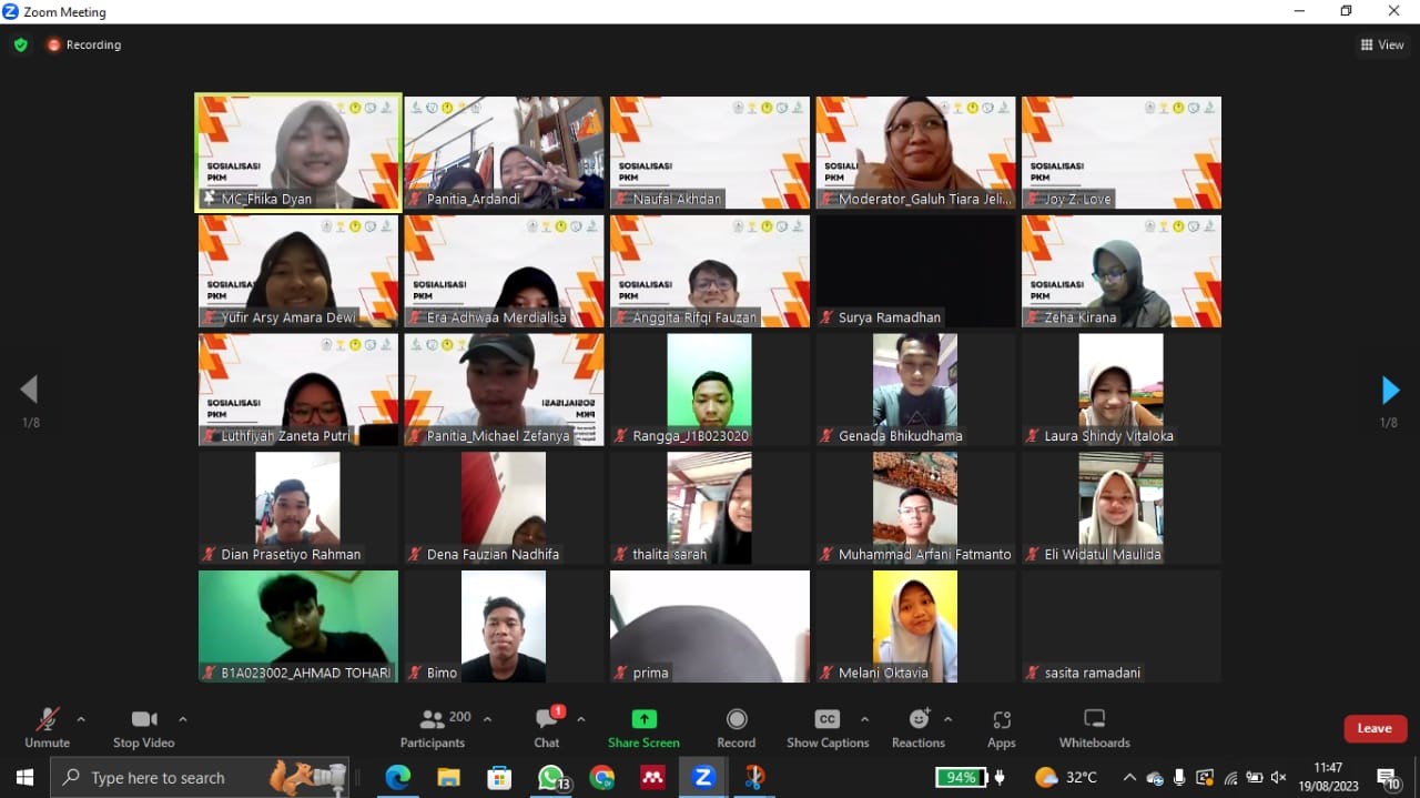 Kegiatan Sosialisasi PKM ini diselenggarakan pada Sabtu, 19 Agustus 2023 secara daring melalui platfrom Zoom Meeting. Pembicara dalam seminar ini adalah Bapak Afik Hardanto, S.TP., M.Sc., Ph. D yang merupakan reviewer PKM Nasional serta Zeha Kirana peserta PIMNAS 2022. Dengan kehadiran mereka, seminar ini berjalan dengan santai tetapi tetap mempertahankan tujuan utama dari penyelenggaraan seminar ini.
