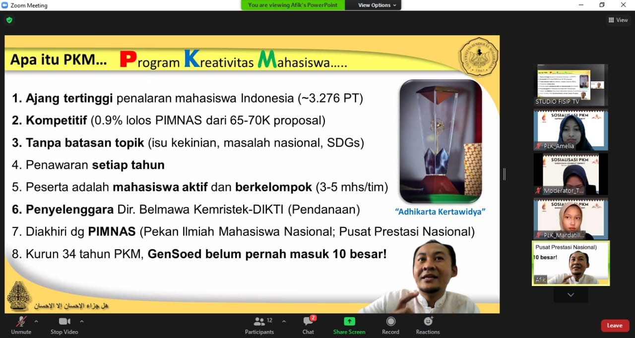 Sosialisasi PKM yang dilaksanakan pada 9 Agustus 2021 dan Workshop PKM yang dilaksanakan pada 22 Agustus 2021 ini berlangsung secara daring melalui platform Zoom Meeting dan disiarkan secara langsung melalui kanal YouTube BEM Unsoed. Dilaksanakannya kegiatan ini bertujuan untuk menggali potensi dan ide kreatif mahasiswa Unsoed melalui Program Kreativitas Mahasiswa (PKM), sekaligus meningkatkan budaya prestatif mahasiswa di bidang PKM untuk menyukseskan PIMNAS 35.