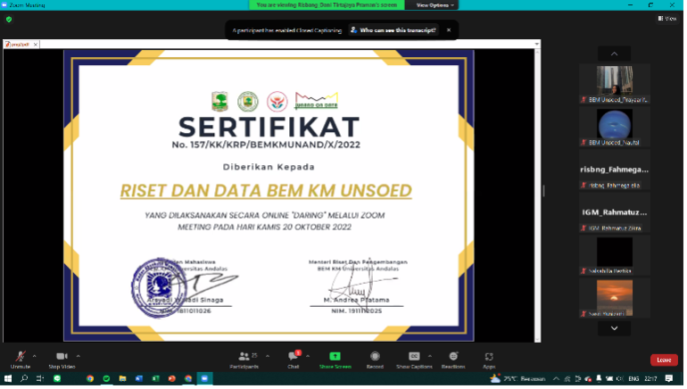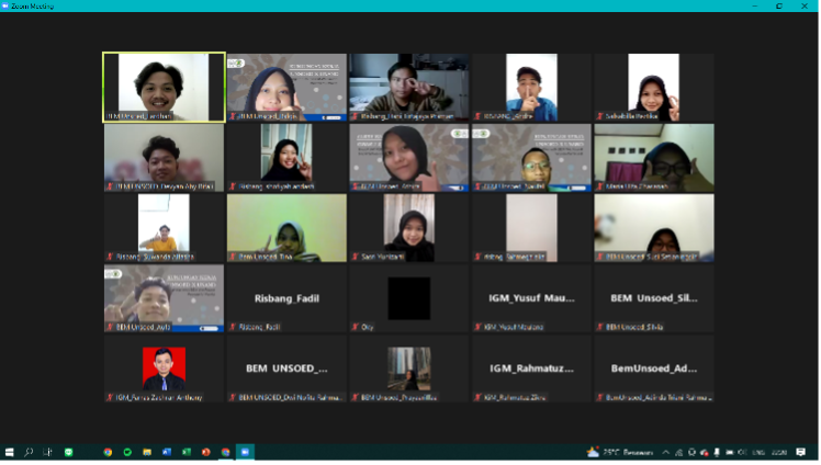 BEM Unsoed – Telah berlangsung Studi Banding antara Kementerian Riset dan Data (Risdat) BEM Unsoed dengan Kementerian Riset dan Pengembangan (Risbang) BEM Unand pada Jumat (21/10), yang diselenggarakan secara daring melalui platform Zoom Meeting. Studi Banding ini merupakan suatu kegiatan yang bertujuan untuk menjalin hubungan kerja sama, bertukar informasi, sekaligus berdiskusi, mengenai program kerja dari Kementerian Risdat BEM Unsoed dan Kementerian Risbang BEM Unand.