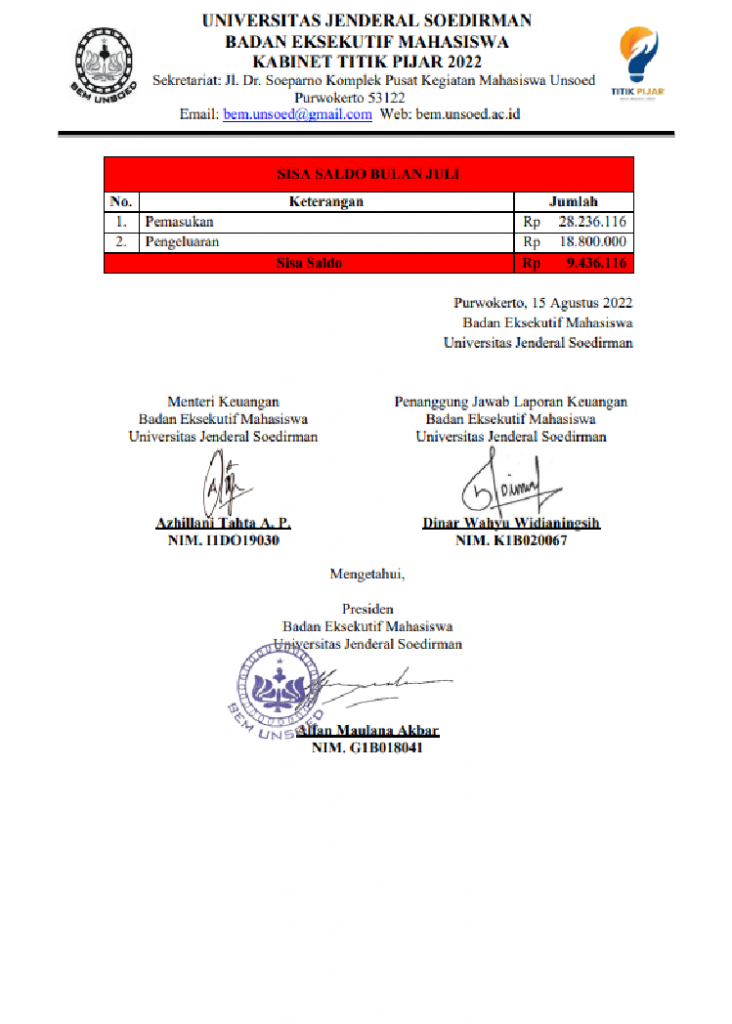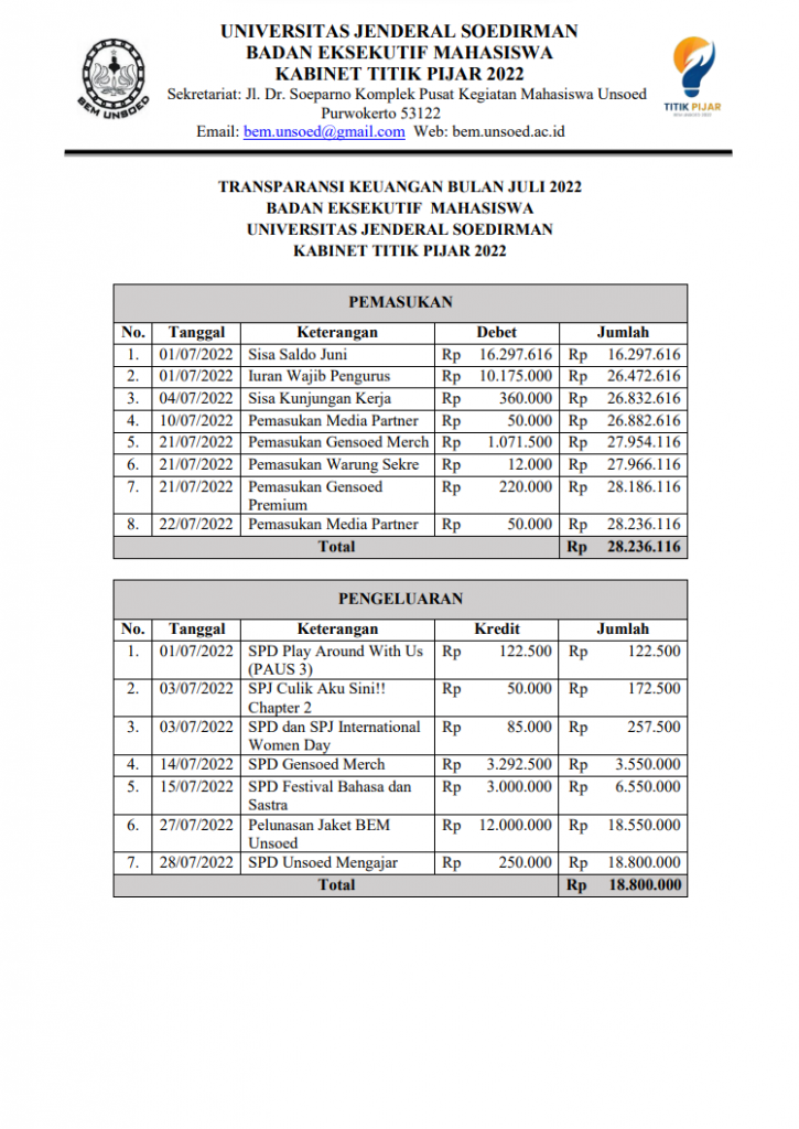 BEM Unsoed – Telah dilaksanakan Transparansi Keuangan BEM Unsoed 2022 pada bulan Juli. Transparansi Keuangan merupakan program kerja Kementerian Keuangan yang menginformasikan kepada KBMU dan masyarakat umum terkait pemasukan dan pengeluaran keuangan BEM Unsoed setiap bulannya.
