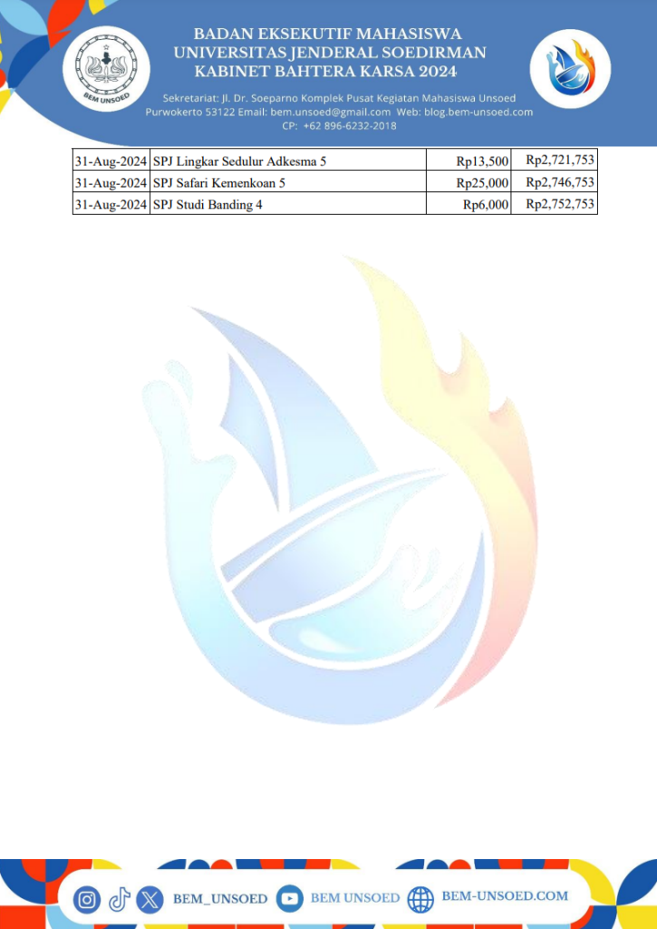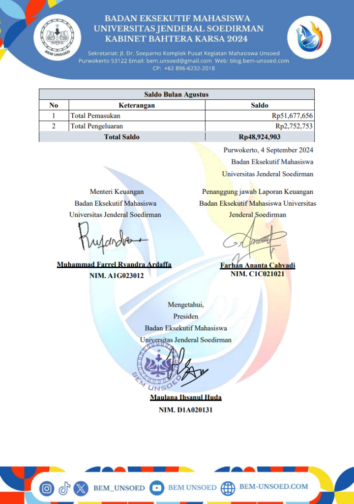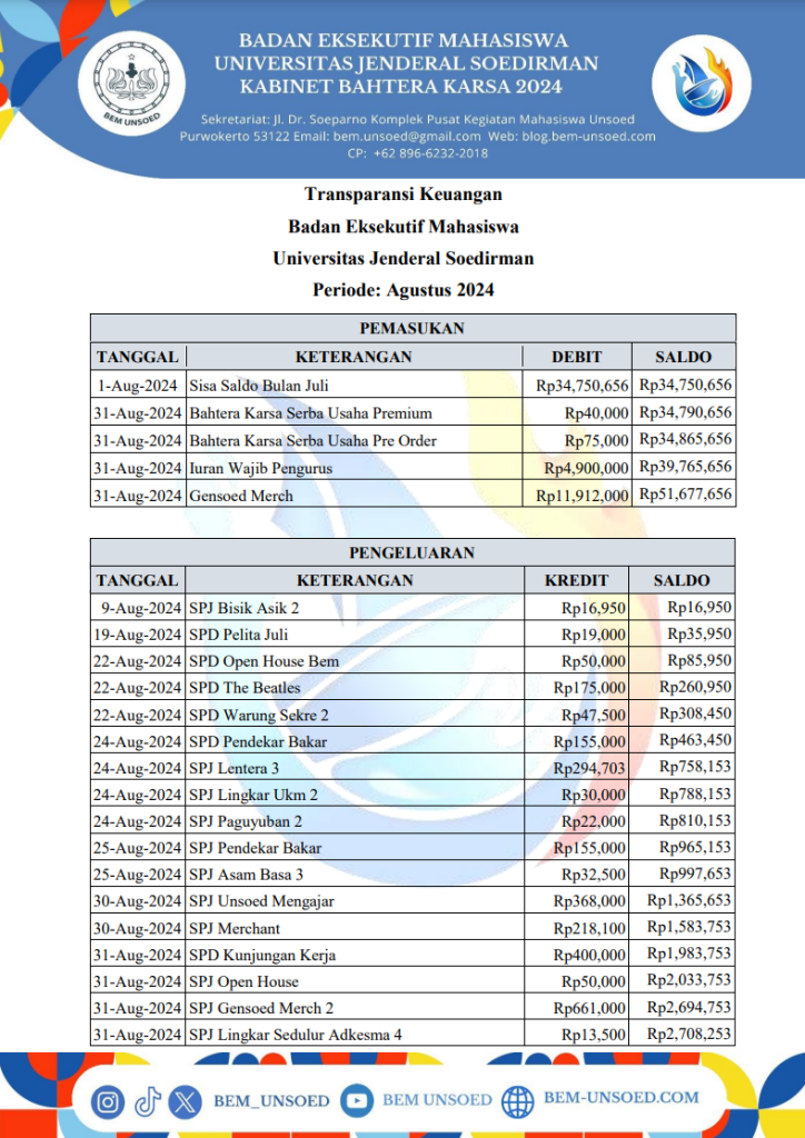BEM Unsoed – Telah dilaksanakan Transparansi Keuangan Badan Eksekutif Mahasiswa Universitas Jenderal Soedirman (BEM Unsoed) 2024 pada bulan Agustus. Transparansi Keuangan merupakan program kerja (proker) dari Kementerian Keuangan yang menginformasikan kepada Keluarga Besar Mahasiswa Unsoed (KBMU) serta masyarakat umum terkait pemasukan dan pengeluaran keuangan BEM Unsoed setiap bulannya.