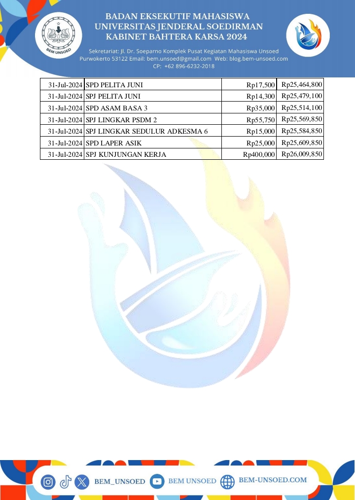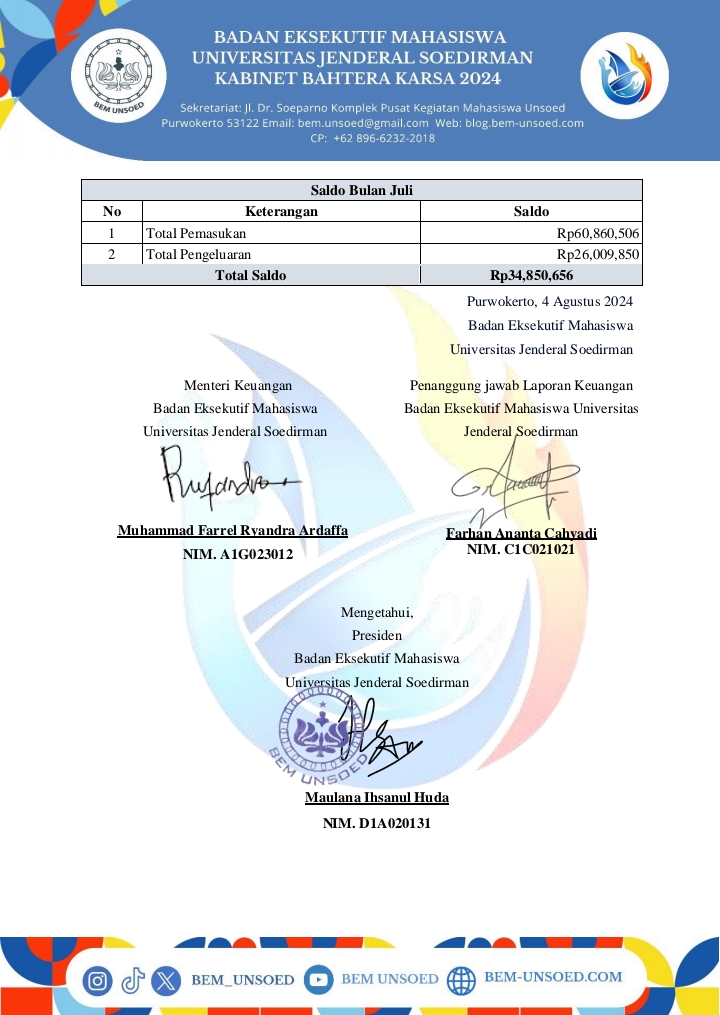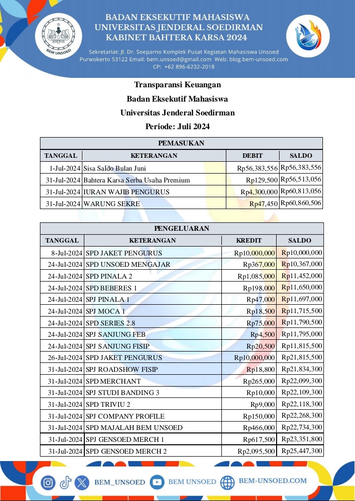 BEM Unsoed – Telah dilaksanakan Transparansi Keuangan Badan Eksekutif Mahasiswa Universitas Jenderal Soedirman (BEM Unsoed) 2024 pada bulan Juli. Transparansi Keuangan merupakan program kerja (proker) dari Kementerian Keuangan yang menginformasikan kepada Keluarga Besar Mahasiswa Unsoed (KBMU) serta masyarakat umum terkait pemasukan dan pengeluaran keuangan BEM Unsoed setiap bulannya.