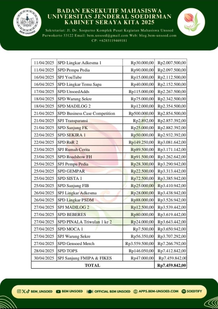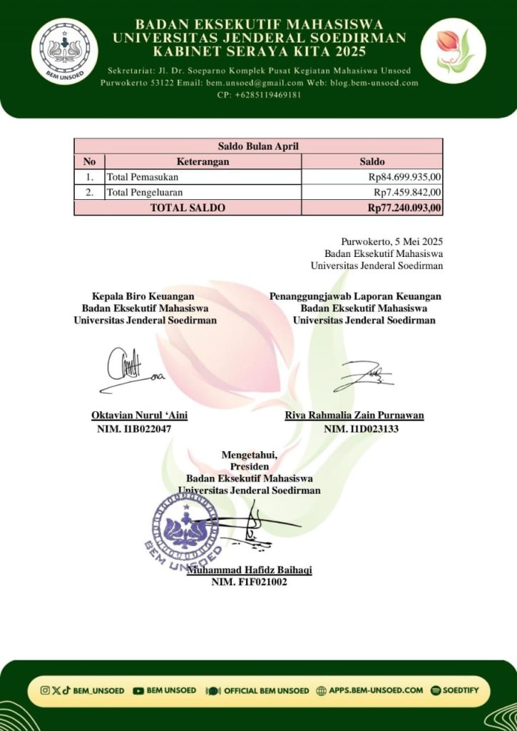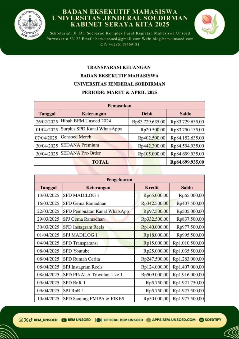 BEM Unsoed – Telah berlangsung salah satu program kerja dari Biro Keuangan Badan Eksekutif Mahasiswa Universitas Jenderal Soedirman 2025 (BEM Unsoed 2025), yaitu transparansi keuangan bulan Maret dan April BEM Unsoed 2025. Transparansi keuangan merupakan program kerja dari Biro Keuangan yang memberikan informasi kepada Keluarga Besar Mahasiswa Universitas (KBMU) dan masyarakat umum terkait pemasukan dan pengeluaran keuangan BEM Unsoed 2025. Biro Keuangan mengawasi dan mencatat setiap pemasukan dan pengeluaran BEM Unsoed 2025. Program kerja ini dilaksanakan setiap bulan dan dipublikasikan di media sosial BEM Unsoed 2025 pada awal bulan.