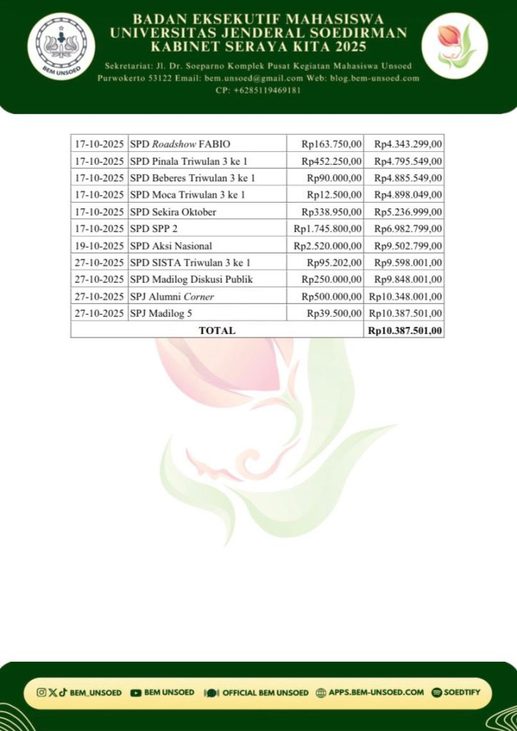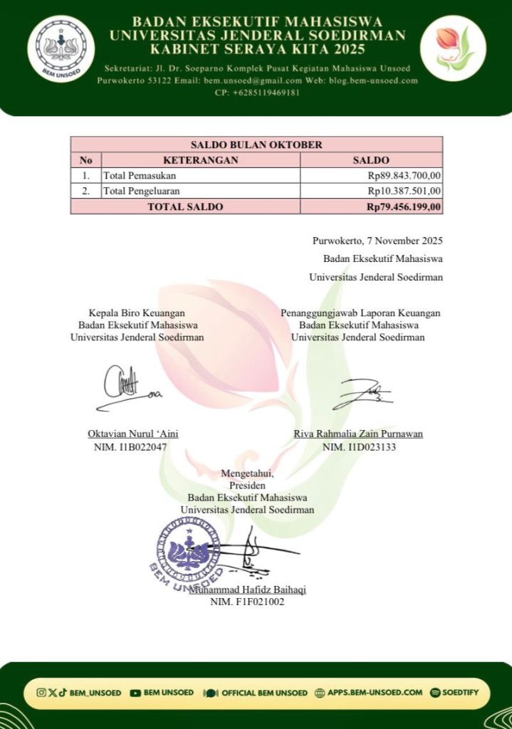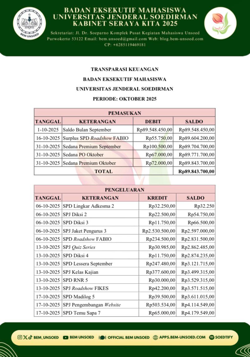 BEM Unsoed – Telah dilaksanakan salah satu program kerja Biro Keuangan Badan Eksekutif Mahasiswa Universitas Jenderal Soedirman (BEM Unsoed) 2025, yaitu transparansi keuangan bulan Oktober BEM Unsoed 2025. Transparansi keuangan merupakan program kerja bulanan yang memberikan informasi kepada Keluarga Besar Mahasiswa Universitas (KBMU) dan masyarakat umum mengenai pemasukan serta pengeluaran keuangan BEM Unsoed 2025. Biro Keuangan mengawasi dan mencatat setiap pemasukan serta pengeluaran BEM Unsoed 2025. Transparansi keuangan dipublikasikan setiap awal bulan di media sosial BEM Unsoed sehingga dapat diakses oleh KBMU dan masyarakat umum.