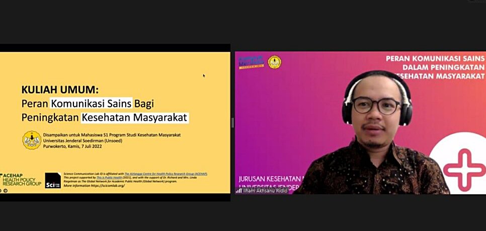 Kegiatan yang diselenggarakan secara daring ini diikuti oleh 110 peserta dari sivitas akademika Jurusan Kesehatan Masyarakat Unsoed. Kuliah Umum ini menghadirkan Ilham Akhsanu Ridlo, S.KM., M.Kes, (Dosen di Fakultas Kesehatan Masyarakat, Universitas Airlangga, Surabaya) yang sedang menekuni bidang kebijakan kesehatan, komunikasi sains dan jurnalisme dan berstatus sebagai Mahasiswa Doktor di Ludwig-Maximilian-Universität Munchen, Jerman. Proyek riset yang sedang beliau kerjakan sebagai mahasiswa Doktor berkaitan dengan topik “An Alliance of Science Journalists and Scientists During The COVID-19 Pandemic.”