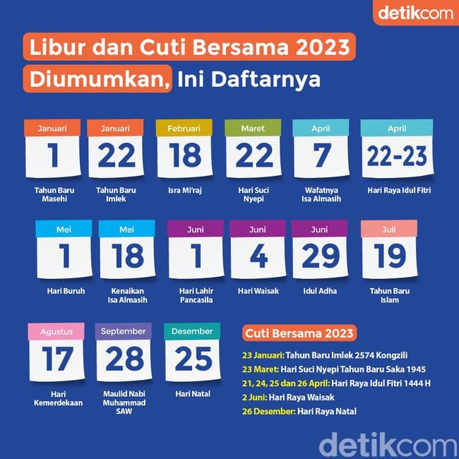 Setelah separuh 2022 kita bertemu libur nasional di weekend, saatnya kita berjumpa lagi dengan libur nasional 2023 di weekday. Daftar hari libur nasional 2023 sudah diumumkan nih oleh pemerintah melalui SKB 3 Menteri yang telah disetujui bersama oleh Menteri Agama Yaqut Cholil Qoumas, Menteri Ketenagakerjaan Ida Fauziyah serta Menteri Pemberdayagunaan Aparatur Negara dan Reformasi Birokrasi Abdullah Azwar Anas.