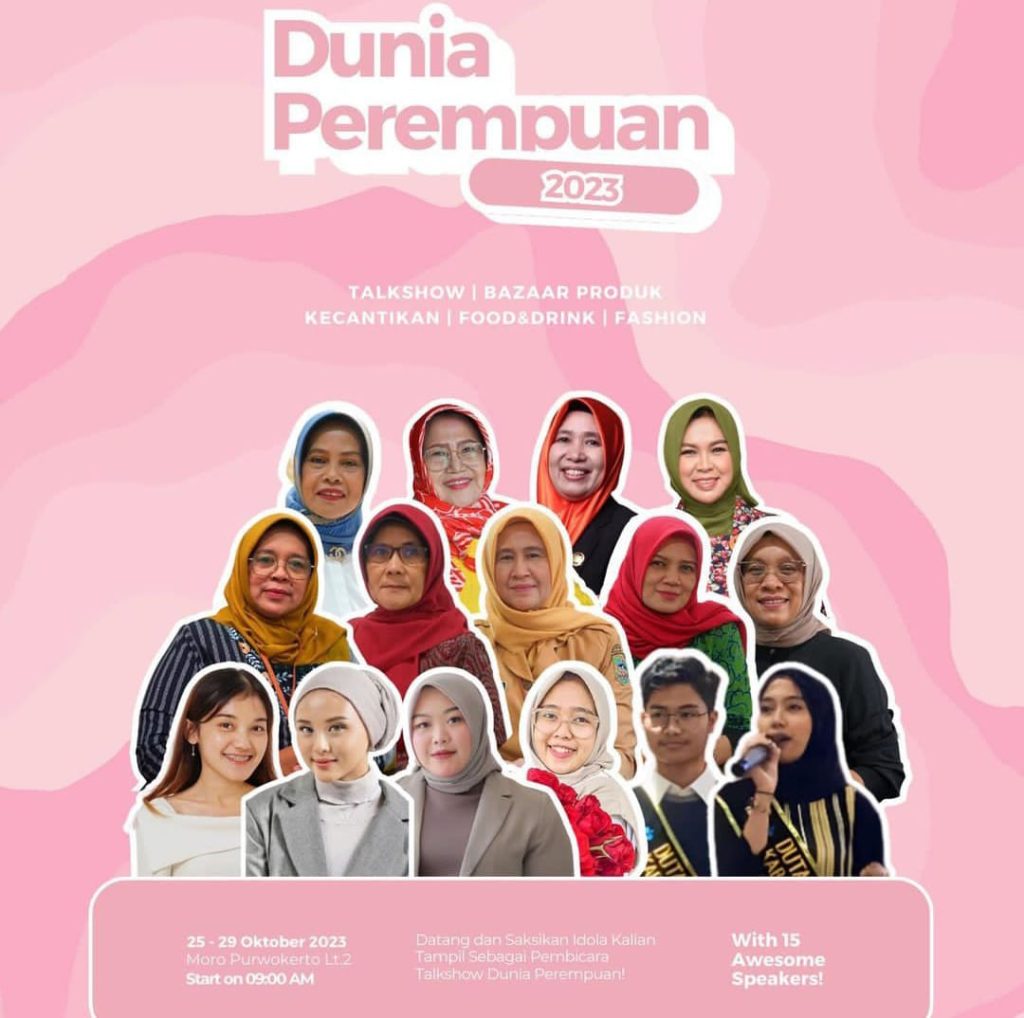 Acara “Dunia Perempuan” merupakan acara yang bertujuan untuk memperbincangkan isu-isu yang relevan dengan perempuan. Acara ini diselenggarakan di Moro Purwokerto dan berlangsung selama lima hari, dimulai pada tanggal 25 Oktober 2023 dan berakhir pada tanggal 29 Oktober 2023. Tujuan utama dari acara ini adalah untuk menghidupkan kembali kegiatan di swalayan Moro Purwokerto serta mengajak masyarakat Banyumas dan sekitarnya untuk mengenang masa lalu di Moro, ketika masih ramai.