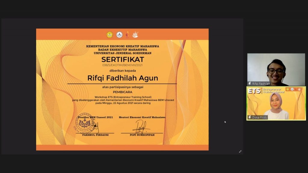 BEM Unsoed – Minggu (22/08), Kementerian Ekonomi Kreatif Mahasiswa BEM Unsoed telah menyelenggarakan Workshop ETS (Entrepreneur Training School) dengan tema “Behind The Scene and How To Choose Platform For Digital Marketing (google ads, facebook ads, instagram ads, etc)” secara daring melalui Zoom Meeting.